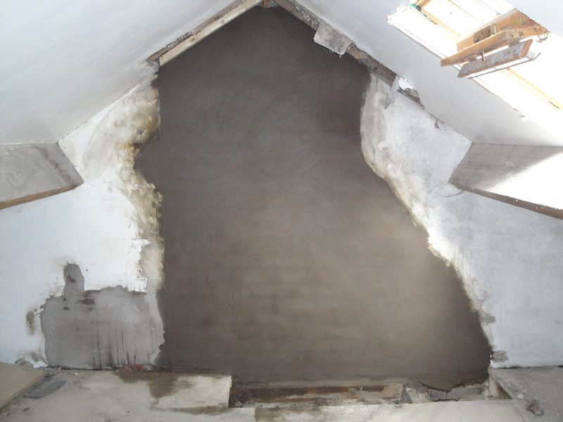 Up in the loft, the walls behind the old chimney stacks have been cleaned up and rendered where necessary, the new roof-light surround has been plastered and the old hole blocked up and skimmed to match the existing roof lining.